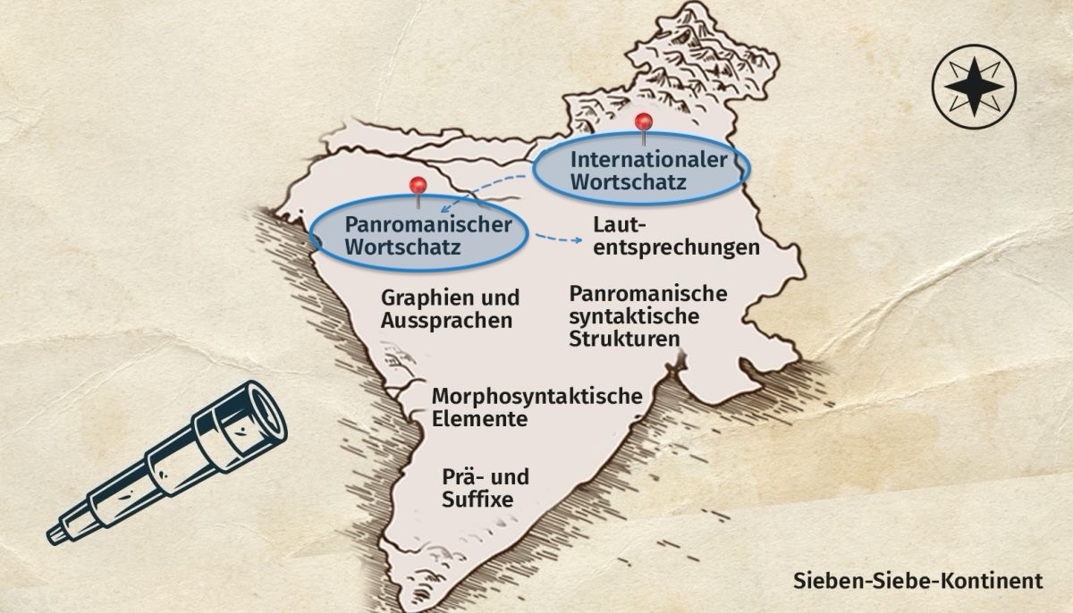 Dort lernst du systematische lautliche Entsprechungen kennen, die über die romanische Sprachenfamilie hinweg zu beobachten sind. Zu wissen, welche Laute oder Lautkombinationen sich in den verschiedenen romanischen Sprachen einander zuordnen lassen, hilft dir z. B. auch dabei, den Transfer zwischen den Wörtern des Panromanischen Wortschatzes in den verschiedenen Sprachen herzustellen.