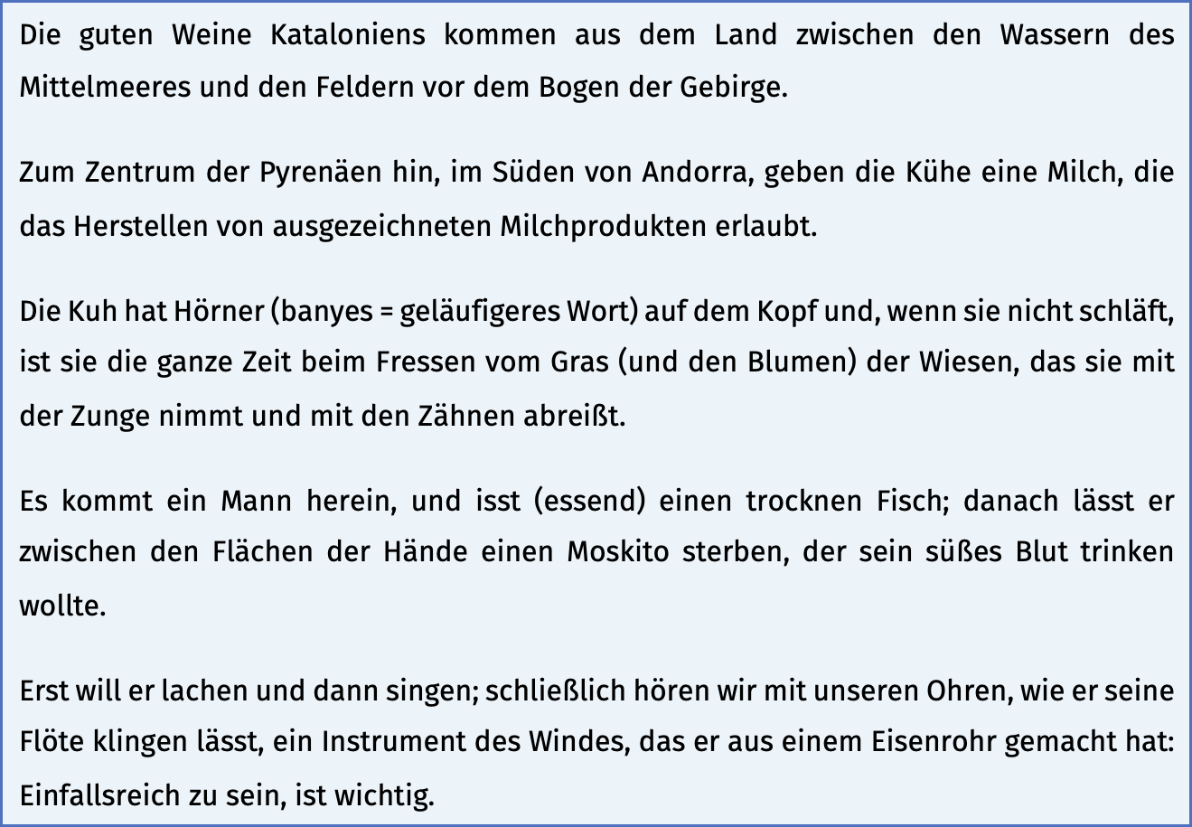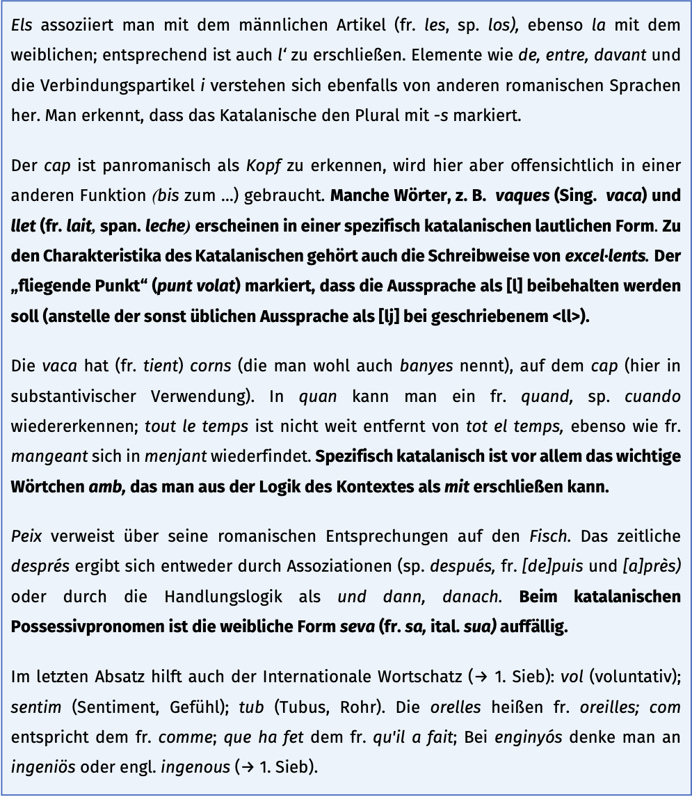 Hier einige Assoziationshilfen, um das Panromanische im katalanischen Text leichter zu erkennen. Hinweise auf spezifische Charakteristika des Katalanischen sind fett markiert.
