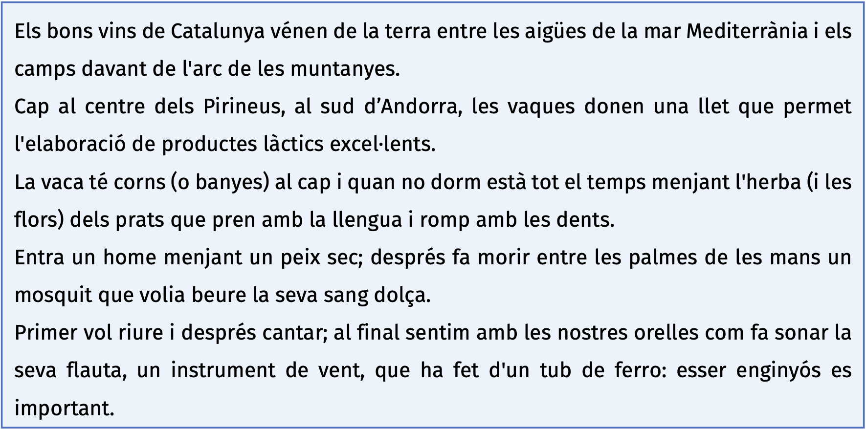 Der folgende Text enthält einen hohen Anteil an Wörtern aus dem panromanischen Erbwortschatz im Katalanischen: